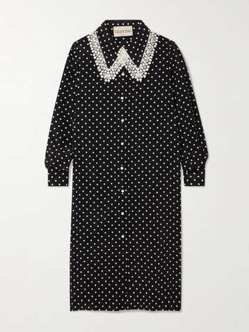Lace-trimmed polka-dot printed silk crepe de chine midi dress
