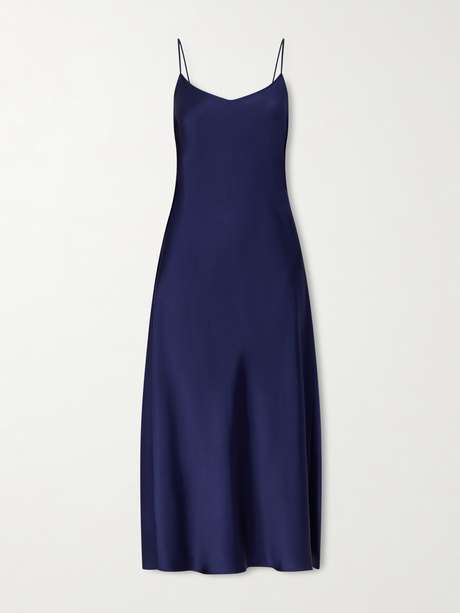 Another Tomorrow's dress takes notes from '90s minimalism. Cut from fluid satin to skim your figure, it has thin rouleau straps that frame the subtle V-neckline. Both gold and silver jewelry will complement the rich indigo shade.