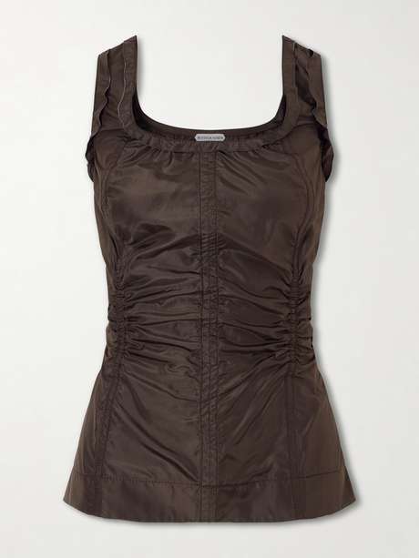 Bottega Veneta is celebrated for modern, understated luxury and expert craftsmanship. This tank reinterprets a classic silhouette in taffeta, featuring panels and gathered detailing that add texture and gentle movement. Cut to skim the body, it blends sculptural structure with a tactile finish, making it a sophisticated, contemporary wardrobe essential.