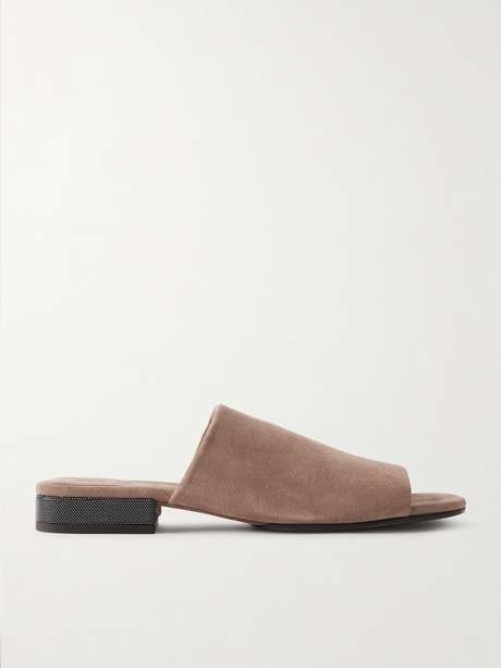 Brunello Cucinelli's mules have been crafted in Italy from supple suede. Elegant in their simplicity, they have wide straps and rest on slight block heels that are adorned with the label's signature monili beads.