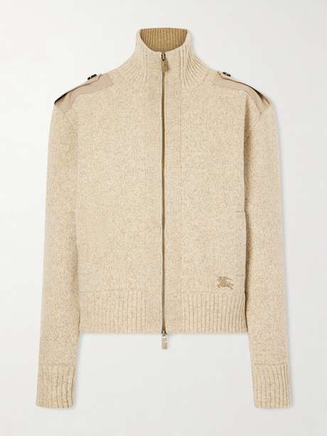 Burberry's zip-up cardigan references the brand's rich heritage with trench-inspired gabardine epaulettes at the shoulders. It's knitted from double-faced wool-blend for a regular fit and has a chunky funnel neck and ribbed trims. The embroidered 'Equestrian Knight' logo sits at the hip.