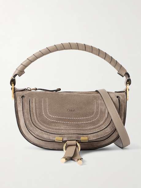 Constantly reinvented season after season, Chloé's 'Marcie' returns with a crescent slouchy shape. It has been crafted in Italy from supple suede, with signature saddle stitching and gold-tone hardware. Fasten the tassels to keep your belongings secure: think phone, cardholder and hand cream.