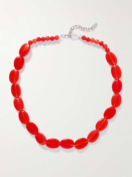 Completedworks' necklace will work with practically any outfit and make every look that much bolder. Handmade from rhodium-plated brass, it's strung with glossy red agate beads, descending from flat oval shapes to smaller rounds at the back. The length can be adjusted between 16- and 18-inches.