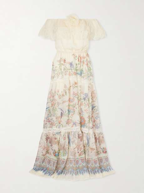 Etro's dress channels a romantic, bohemian spirit. Made in Italy from flowing silk-chiffon, it features elegant lace inserts that outline the tiered skirt and off-the-shoulder neckline. A charming print of songbirds and blooming flowers trails along the train, enhancing its ethereal movement.