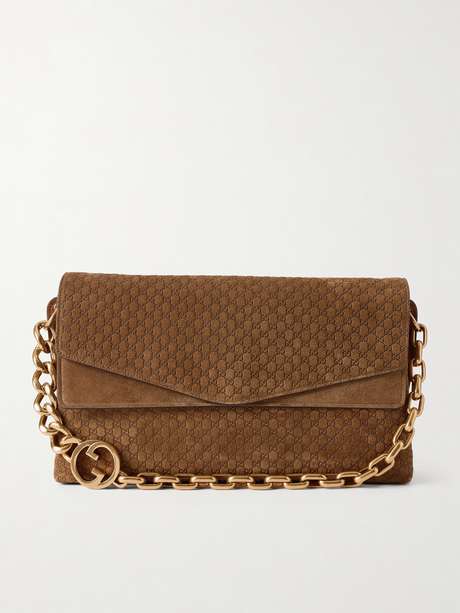 A closer look at Gucci's shoulder bag reveals it's debossed all over with the house's iconic 'GG' monogram. It's crafted from suede and fixed to a gold chain strap that includes an archival interlocking 'G' moniker. You'll find inside deceptively spacious - it will easily fit your daily essentials and a journal.