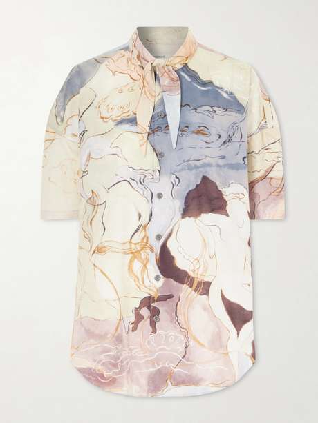 Lemaire’s collections embody quiet luxury, blending functionality with modern sophistication. This blouse is cut from airy cotton and printed with a colorful aquarelle motif for a romantic feel. It has a close fit and is finished with a scarf detail in place of a classic collar.