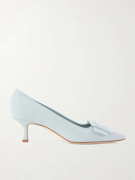 The pilgrim-inspired buckles topping Manolo Blahnik's 'Maysale' shoes were developed in 1991 for Isaac Mizrahi's runway collection - they're now so iconic that an original pair of mules with the signature detailing features in The Metropolitan Museum of Art's prestigious costume collection. These pumps have been made in Italy from soft suede and have slim, flared 50mm heels. The toe is elegantly pointed.