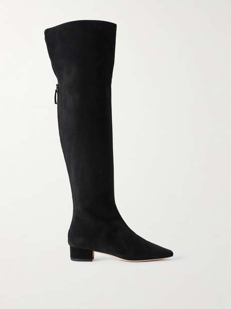 The pared-back design of Manolo Blahnik's 'Gore' boots underscores their versatility while highlighting the house’s renowned craftsmanship. Made from velvety suede, they have narrow squared toes and manageable block heels. The back splits ensure a comfortable fit, even when worn with pants tucked in.