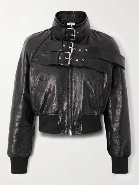 McQueen is renowned for designing exceptionally cool biker jackets interpreted with signature precision and drama. This version features three oversized buckles across the chest for a punkish feel. It's made from leather and has cinching elasticated edges.