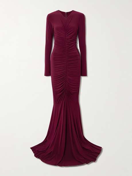 The ruching on Norma Kamali's gown accentuates curves in all the right ways. It's made from stretch-jersey that flares into a fishtail hem. Offset the deep plum shade with silver jewelry.
