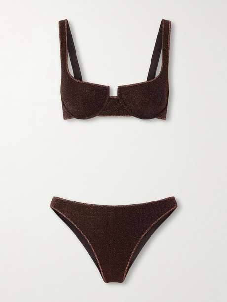 Oséree's 'Lumière' bikini is made from dark-brown metallic fabric that shimmers as it catches the light. It has a balconette top with supportive wired cups and low-rise briefs. Wear yours with one of the label's coverups.