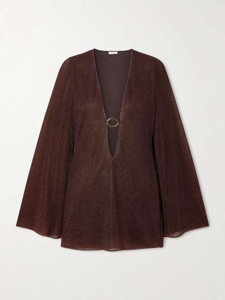 Just like the swimwear from Oséree's 'Lumière' collection, this kaftan is made from metallic stretch-knit that only looks more glamorous in the light. It has a slim silhouette with a plunging neckline that's punctuated by a signature gold-tone ring. The oversized bell sleeves add dimension and movement.