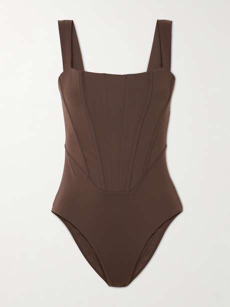 STAUD's 'Adelaide' swimsuit is defined by the supportive corset-inspired boning and on-trend 'Dark Chocolate' hue. Made from panels of stretchy fabric blended with 67% recycled fibers, it has wide shoulder straps and an elongated zip pull.