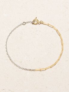 Hours spent trawling through flea markets and her grandmother’s jewelry boxes for unique vintage finds inspired Yvonne Léon to design a collection of her own – one that honors traditional design rules but breaks a few, too. “The mix of yellow and white gold creates a stunning contrast and adds a unique dimension,” says Léon. “As well as using mixed metals, we also play with textures and shapes to create unique pieces.” A modern interpretation of classic signets, the designer’s ‘Mini Chevalière’ ring is a harmonious mix of 9-karat yellow and white gold – the latter framing a halo of scintillating diamonds – arranged in elegant braids. Elsewhere, a simple chain bracelet in contrasting tones and links offers a subtler take and can easily be worn alongside the single-tone styles you already own.