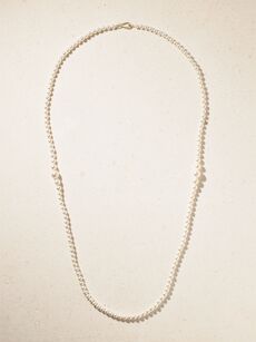 Those who want a design long enough to be worn as a single or double loop will appreciate Mizuki’s modern take on the classic pearl necklace, which features gradually larger, lustrous freshwater pearls strung along its entire 33-inch length. Marie Lichtenberg offers similar versatility with its signature locket-style necklaces, each silk string inspired by Indian Mauli cords – handwoven threads believed to have talismanic qualities. These extra-long styles allow you to alter their length depending on any mood or ensemble – it’s simply up to you to choose how low you go.