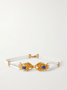 And that sentiment very much rings true when it comes to Sonia Petroff. Take, for example, the ‘Dragonfish’ belt — a woven-rope design affixed with the sculptural motif of two fish, as if rippling through the water in flames. This mythical creature is a potent combination of mythology and evolution; an imagined species that mixes the earth’s elements. Dreamed up by Petroff and rendered anew by creative director Maria Leoni-Sceti, the symbolism feels almost Dalí-esque. Encrusted with marbled blue cabochons, it’s the perfect accessory to cinch a billowy spring dress.