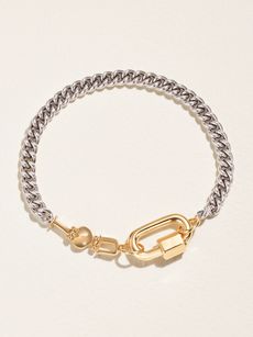 Few jewelry designers are as inventive as Marla Aaron, who launched her New York-based brand in 2012. Obsessed with architecture, bridges and hardware, Aaron took her inspiration from the many bold lines and artful angles of the Big Apple, defining the brand’s DNA to encompass a rich repertoire of chains and carabiner locks. While an industrial carabiner – more often used by rock climbers – is generally plain and practical, Aaron’s carabiners come in all shapes and forms, from those shaped like lightning bolts to those encrusted with rainbow gems. The ‘Curb Talking + Chubby Babylock’ silver and 14-karat gold bracelet gives a nod to Aaron’s signature whimsy, with an ‘I Heart U’ charm that softens its nuts-and-bolts feel.