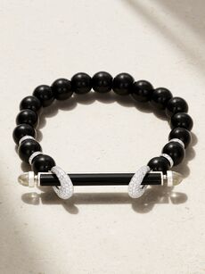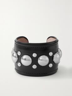 “Despite sourcing so many gemstones in bright and beautiful colors, it’s always important that we have an array of black jewels within our offering, too,” says Emily Johnston, acting fine-jewelry buyer at NET-A-PORTER. “For customers who want to include gemstones within their stack but don’t want to choose a color that might clash with different outfits each day, black jewels can really add some opulence, while remaining ultra-versatile,” she explains. On the runways this season, studded black chokers and strings of swinging black beads amplified the drama of after-dark ensembles, while Alessandra Rich revived the oversized plastic roses of the early 2000s, placing black blooms on bangles with black rhinestone fringing. Resin, satin and leather cuffs were all offered in inky hues – adding an impactful accent to bare arms for punchy party dressing.