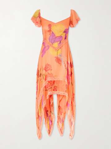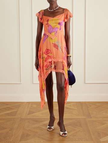 Guava Flores ruffled asymmetric lace-trimmed silk-chiffon midi dress