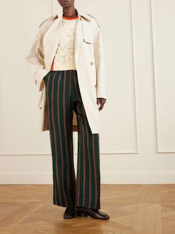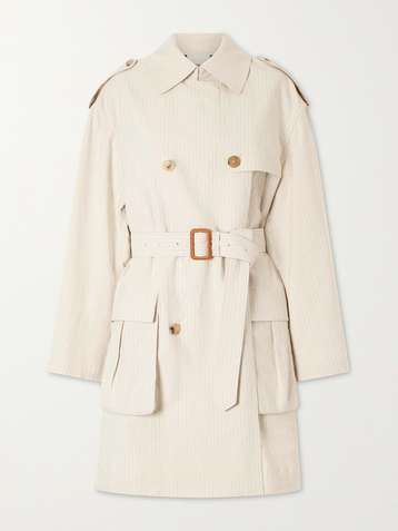 Double-breasted belted striped cotton-blend trench coat