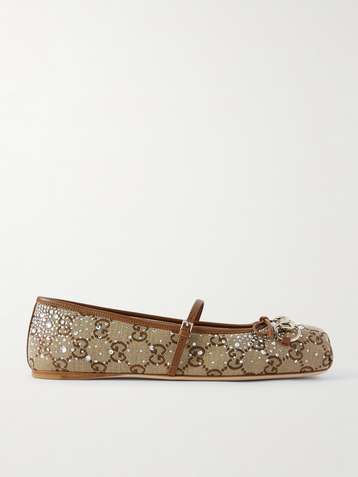 Horsebit Ballerina leather-trimmed crystal-embellished canvas-jacquard flats