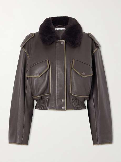Acne Studios reimagines the classic bomber jacket through a pared-back, modern lens. Made from leather with a plush shearling collar, it has a relaxed silhouette that is defined by a utility pocket and ribbed trims. Style it with wide-leg denim or pants to underscore the clean lines.