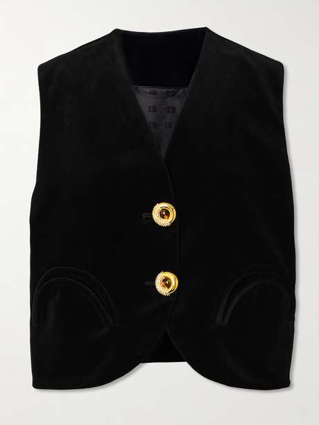 BLAZÉ Milano's 'Jealousy Gliss' vest is a beautiful example of the brand's masterful tailoring. Tailored from cotton-velvet, it has dimensional 'smiley' pockets – a signature of the Italian label's – and crystal-embellished medallion buttons.