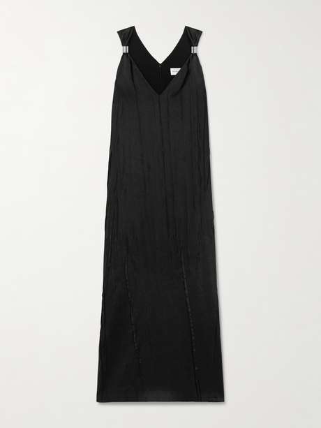 Brandon Maxwell’s ‘The Keke’ dress proves that the smallest details make an impact. It’s cut from lustrous satin that’s intentionally crinkled and has a V-neckline framed by silver-tone embellishments on either side. Accessorize with strappy sandals and a clutch.
