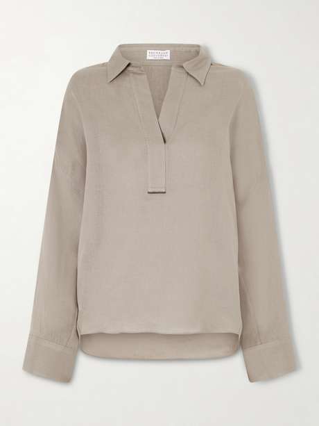 Brunello Cucinelli's blouse has been made in Solomeo, Italy from linen that's breezy and naturally cool. It's cut for a loose fit and has a V-neckline embellished with a few rows of the brand's signature Monili beads.