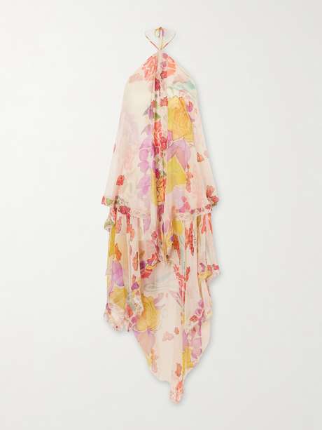 Donde Esteban's 'Flores' dress channels the label's light, feminine spirit. Named after the blossoms scattered throughout, it's cut from silk-chiffon and designed with a halterneck and cascading, lace-trimmed ruffles.