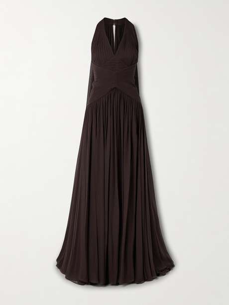 Elie Saab's floor-sweeping gown is designed with a cape-effect back panel that creates a beautiful train. Cut from silk-georgette, it has an intricately gathered bodice with an inverted front panel that cinches and accentuates your waist. The chocolate shade looks especially striking with gold jewelry.