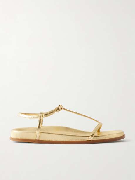 The 'Aya' sandals by Emme Parsons are defined by delicate straps that form a T-shape across the foot and loop around the ankle. Crafted from washed gold nappa leather, they rest on a welted footbed and are finished with a slender buckle to adjust the fit.