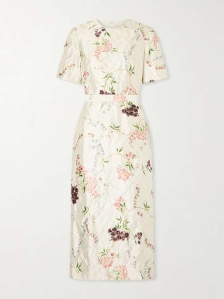 Erdem is renowned for romantic, richly detailed designs. Inspired by the style of Marie Antoinette, this midi dress is cut from lustrous crinkled satin in a pencil silhouette and patterned with a trail of florals. Use the waist belt to define the fit.