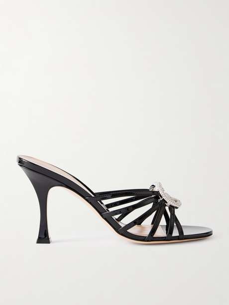 Gucci's sandals capture evening elegance with ease. Made in Italy from glossy patent-leather, they feature a cage-like strappy design and crystal-embellished 'Interlocking G' emblems. Set on 90mm curved heels, they're a refined choice for dinners, parties or nights out.