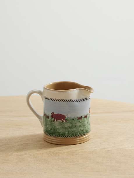 Blending playful design with artisanal heritage, this small cylinder jug is part of JW Anderson’s collaboration with Irish pottery studio Nicholas Mosse. Handcrafted using a traditional 20-step process, it features a whimsical pig motif brought back from the archives and painted in signature spongeware style.