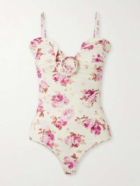 Magda Butrym's romantic floral applique appears to unravel along the strapless neckline of this swimsuit. It's made from quick-drying stretch fabric that's gathered along the cups and is printed with vivid blooms.