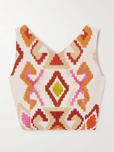 Marta Ferri's top is inspired by the vibrant spirit of Santorini. Woven with plenty of linen, it's embroidered with colorful geometrics and has a close, cropped fit. Wear yours as a set with the matching skirt in our edit.