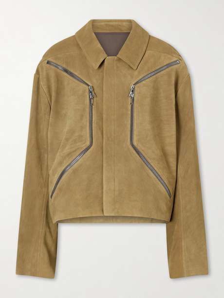 Rick Owens' 'Blixa Mac' jacket reflects the label’s commitment to turning everyday staples into statement pieces. It's crafted from supple suede in a boxy silhouette and framed by geometric silver-tone zips to emphasize the proportions.