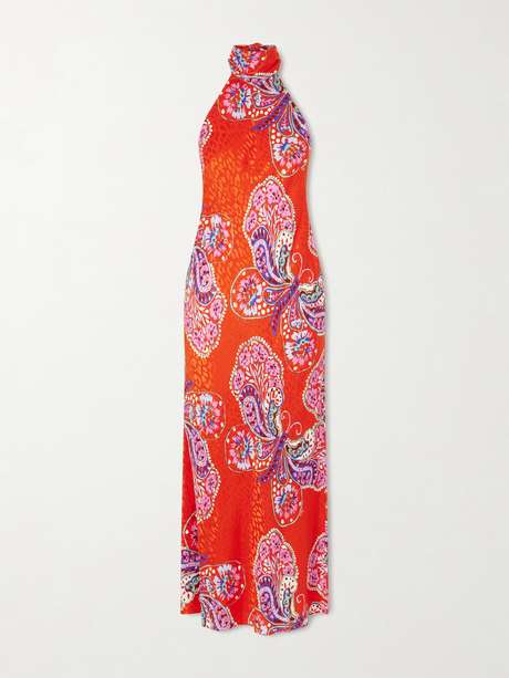 The understated elegance of RIXO's 'Maura' midi dress is rooted in vintage style that keeps the founding duo freshly inspired. It's cut from jacquard and is printed with striking butterflies throughout. The languid halterneck ties sway gracefully as you move.