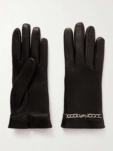 A quiet statement of modern luxury, SAINT LAURENT’s gloves are designed with understated confidence. Crafted in Italy from supple black leather, they’re accented with a slim silver-tone chain and minimalist logo at the cuff.