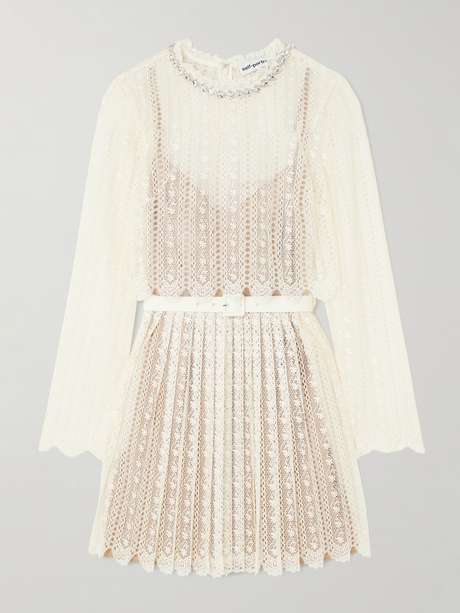 Designed to appear like separate garments, Self-Portrait's dress beautifully captures a bohemian feel. Cut from lace and lined with a slip for coverage, it has a crystal-embellished ruffled neckline and pleated mini skirt. Wear yours with a minaudière and heels.