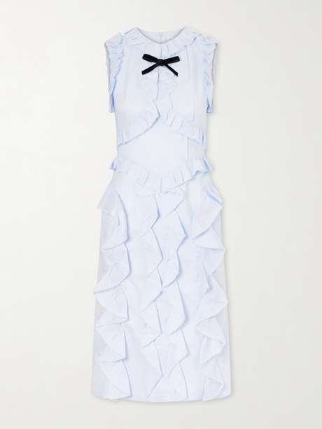 SHUSHU/TONG’s linen dress is defined by its intricate construction, where ruffles are precisely layered to trace and contour the bodice. A bow punctuates the neckline, while the skirt is built in tiered panels that create volume without losing that sense of delicacy.
