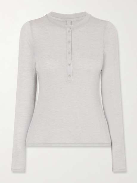 SKIMS Long Sleeve stretch-modal and cashmere-blend Henley Top - Light Heather Gray
