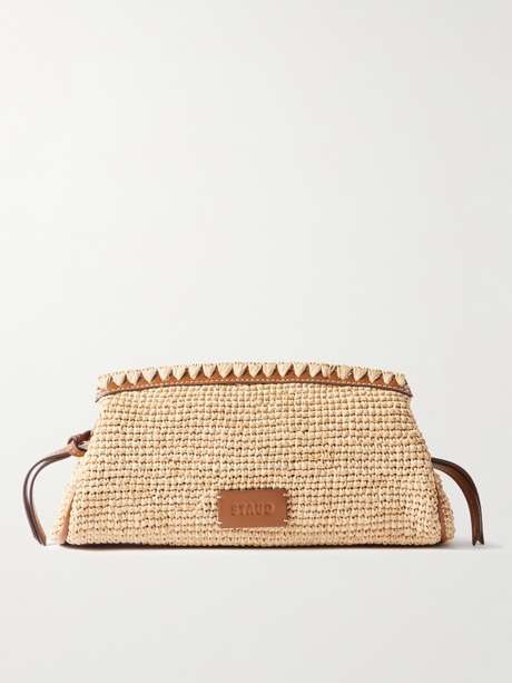 STAUD's 'Maude' clutch blends natural texture with thoughtful design. Made from raffia and finished with the label’s signature knotted side ties, it has a compact interior sized to fit a phone, wallet and sunglasses.