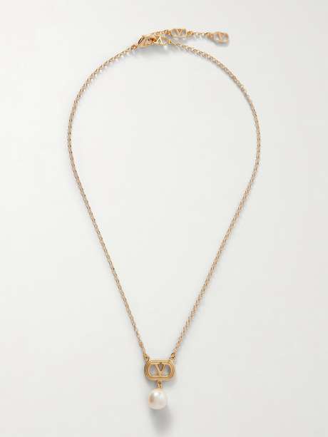 Valentino Garavani's necklace is made from gold-tone brass with a dainty chain. It's strung with the iconic 'VLogo' pendant and has a lustrous Swarovski faux pearl droplet – it rests elegantly on your décolletage.