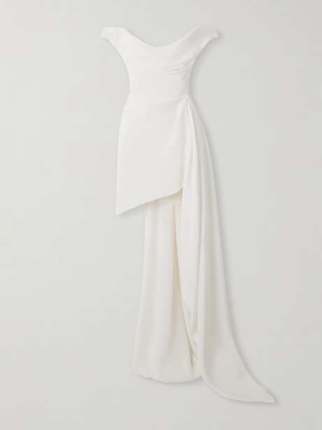 Vivienne Westwood's bridal 'Comet' dress pays homage to the iconic 'Bagatelle' silhouette from the '97 collection. Crafted from silk-cady, it has an off-the-shoulder neckline and cascades with a draped, floor-sweeping train. It balances sculpted elegance with historic romance, a piece made for entrances that linger long after the first dance has ended.