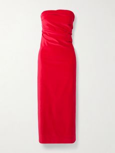 To make a truly unforgettable entrance, pull out all the stops in Tove’s ‘Sabella’ midi dress from NET-A-PORTER’s exclusive edit. “I turn to Tove time and time again for occasion dressing – from weddings to cocktail events – and I wore my favorite dress of all time by the brand to the Fashion Awards earlier this month,” says NET-A-PORTER’s content director, Alice Casely-Hayford. “I adore everything that co-founders Camille and Holly create. The cut, fit and color of their designs are always exquisite, understated and effortlessly elegant. This ruched red velvet number is perfect for party season. I love baring my shoulders in a strapless dress, as the flash of skin feels sexy but still chic,” she adds.