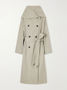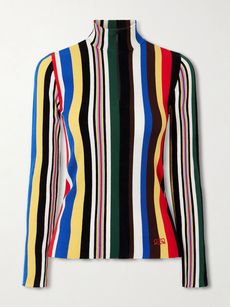 What we’re wearing: Beige pants, a slouchy striped knit and old-money sunglasses.