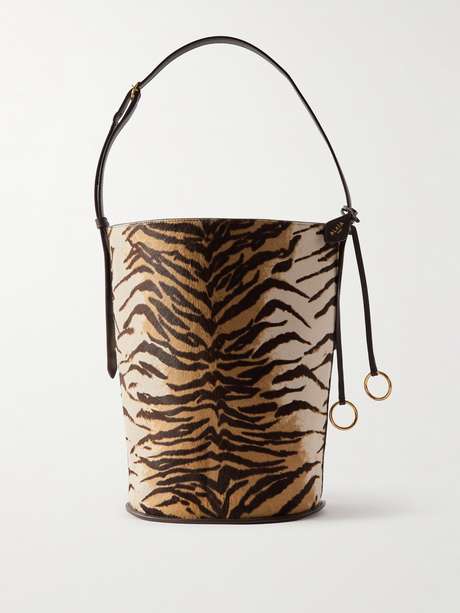 Embracing this season's animal-print trend, Alaïa's bucket bag is patterned in tiger stripes. It's made from calf hair and has a supple leather base and top handle that's finished with the signature gold-tone rings. You'll fit a camera, sunglasses and lip color inside.