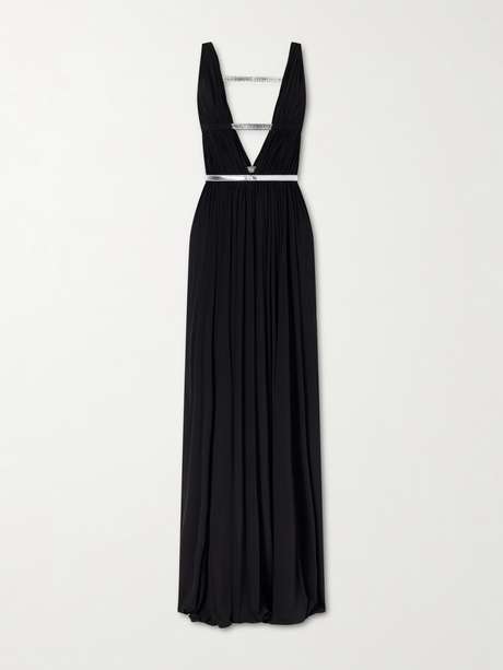 Alaïa's softly pleated gown is strikingly beautiful in its simplicity. It's made from smooth jersey and has strips of metallic elaphe, which you could match some silver jewelry to.